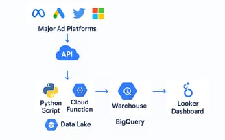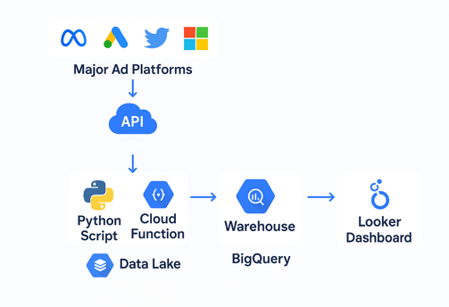 This GCP-based data pipeline ingests ad platform data via Python scripts in Cloud Functions, triggered by Cloud Scheduler, with credentials managed by Secret Manager. Raw data is stored in Cloud Storage (Data Lake) before being loaded, transformed, and warehoused in BigQuery. Finally, Looker connects to BigQuery to create interactive dashboards for insightful ad performance visualization. This GCP-based data pipeline ingests ad platform data via Python scripts in Cloud Functions, triggered by Cloud Scheduler. Raw data lands in Cloud Storage (Data Lake), then moves to BigQuery (Data Warehouse) for processing and transformation. Finally, Looker connects to BigQuery, providing interactive dashboards for comprehensive ad performance insights.
