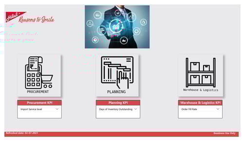 The Hilal Power BI Dashboard provides comprehensive analytics and insights across various operational domains, including procurement, planning, and warehouse and logistics. The data is organized into key performance indicators (KPIs), segmented by categories such as materials, vendors, locations, and regions. The report uses formulas to derive insights and track trends over specific periods.