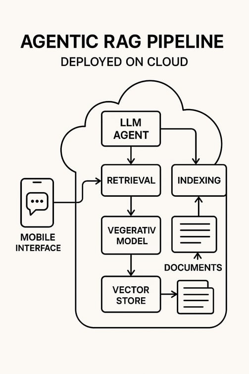 An Agentic RAG (Retrieval-Augmented Generation) pipeline deployed on the cloud integrates advanced language models with planning, memory, and reflection capabilities. The system dynamically retrieves relevant information from cloud-hosted data sources, reasons over it, and generates personalized, context-aware responses. The mobile app acts as the user-facing interface, enabling real-time interaction, updates, and feedback. Cloud infrastructure ensures scalable processing, secure storage, and continuous learning, while the agentic layer empowers the system to adapt intelligently over time, offering a highly personalized and responsive user experience.